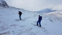 Jan and Monika’s funky soup and fab Polish lamb dish warmed us all up on Saturday night… and the more youthful of the group found yet more carousing energy anticipating another slow start the next day…..…But when we awoke on Sunday we were met by the bella vista of several inches of snow, which although not really enough to promise good conditions did at least get us all whipped up into action….Bob christened his new skis and boots with Ewan and Alex up in a gully on Bhein na Lap (?spelling!). Andy started off with them but literally got blown back down the hill by the high winds, managing a wee snow/heather/tussocky ski back down and Nordic style cross country ski round the Loch tracks. John, Alice and Andrew got up into the snow line with stunning views and the others did various other low level options.