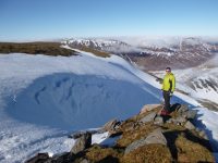 They finally came to the top of a ridge and stopped for more food – I helped clear up anything they dropped. After a brief rest, they set off again, (some on skis, some on foot) for the summit which was up an easy snow slope. What a view from the top! We were now above the cloud and could see several mountain tops sticking out. I heard the names Creag Meagaidh, Ben Alder and The Ben mentioned.