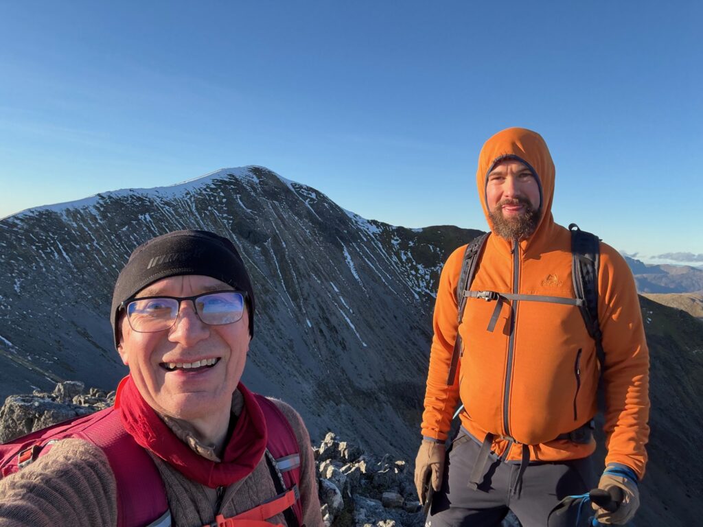 The first summit, Sgòrr Bhan (947 m), provided fine views of the two Munros ahead. The panoramic scenery from both summits was breathtaking. After a short rest for photographs and lunch, we descended via the steep, icy mixed terrain of the northern corrie.